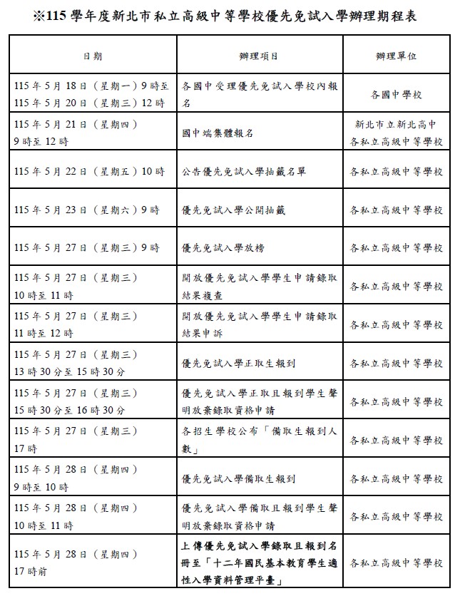 新北市115學年度私立高級中等學校優先免試入學招生簡章